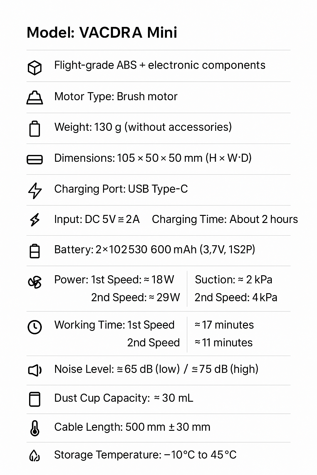 - If not used for a long time, recharge the VACDRA Mini every 3 months to maintain battery health.